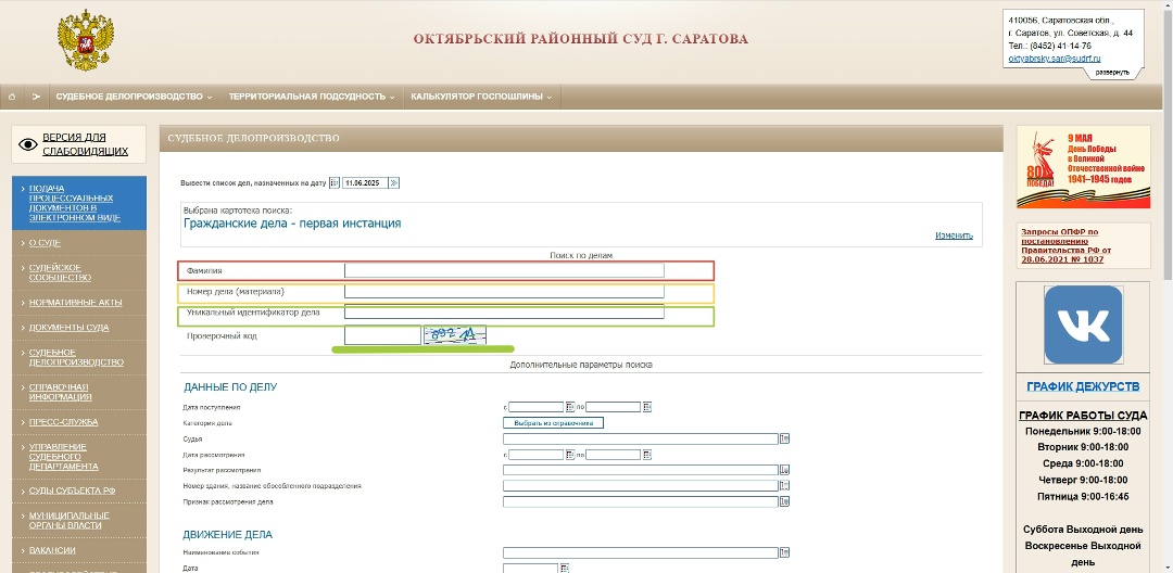 ![]() | 4. В появившемся поле следует ввести либо фамилию участника процесса, либо номер дела или материала, либо уникальный идентификационный номер дела и обязательный проверочный код. Расположение полей: «Фамилия», «Номер дела», «УИН». |