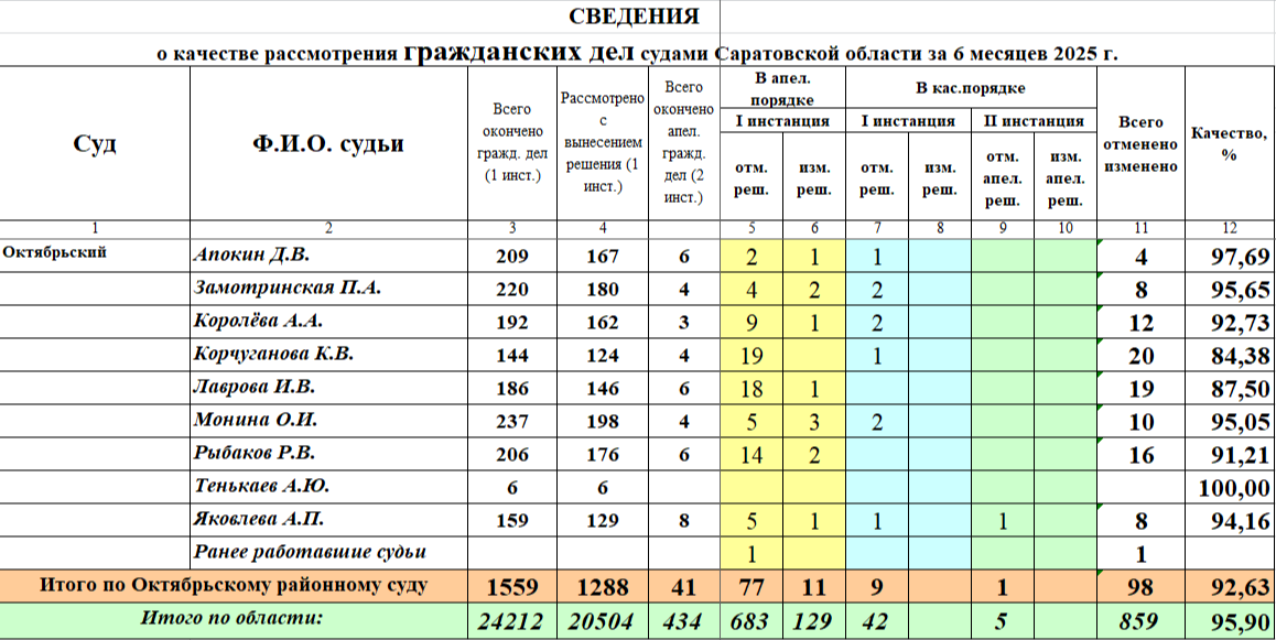 Сведения о работе судей за 2 квартал 2025 года по рассмотрению гражданских и административных дел