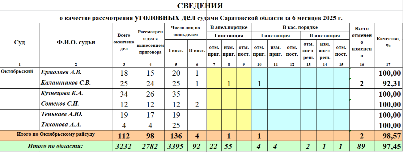 Сведения о работе судей за 2 квартал 2025 года по рассмотрению уголовных дел