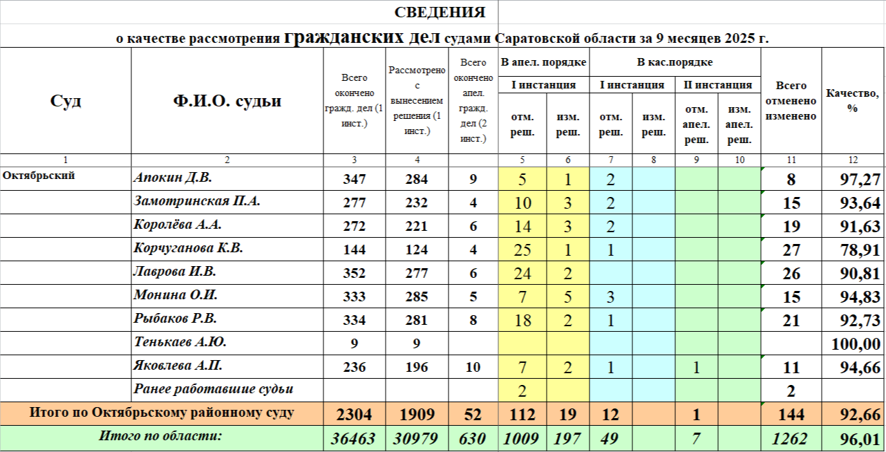 Сведения о работе судей за 3 квартал 2025 года по рассмотрению гражданских и административных дел