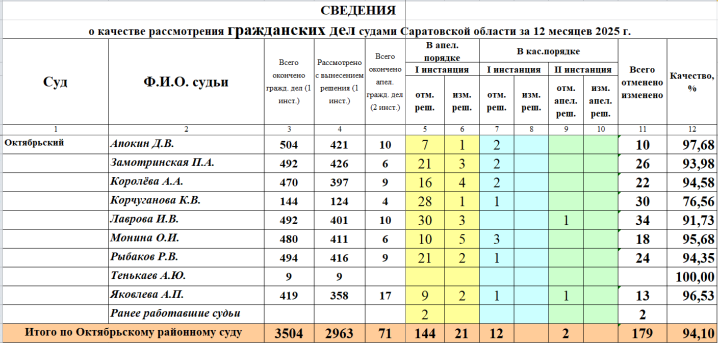 Сведения о работе судей за 4 квартал 2025 года по рассмотрению гражданских и административных дел
